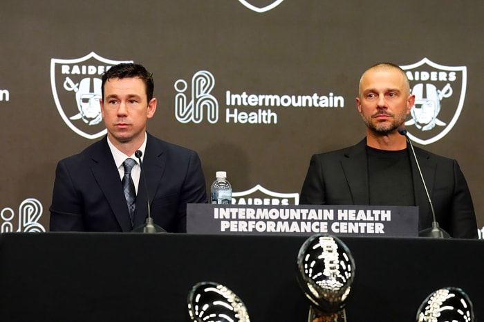 Feb 10, 2026; Henderson, NV, USA; Las Vegas Raiders coach Klint Kubiak (left) and general manager John Spytek at introductory press conference at Intermountain Health Performance Center. Mandatory Credit: Kirby Lee-Imagn Images
