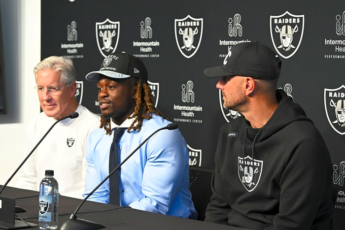 Apr 25, 2025; Henderson, NV, USA; (L-R) Las Vegas Raiders head coach Pete Carroll, Ashton Jeanty and general manager John Spytek during a news conference introducing Jeanty as the first round draft pick in the 2025 NFL Draft at Intermountain Health Performance Center. Mandatory Credit: Candice Ward-Imagn Images