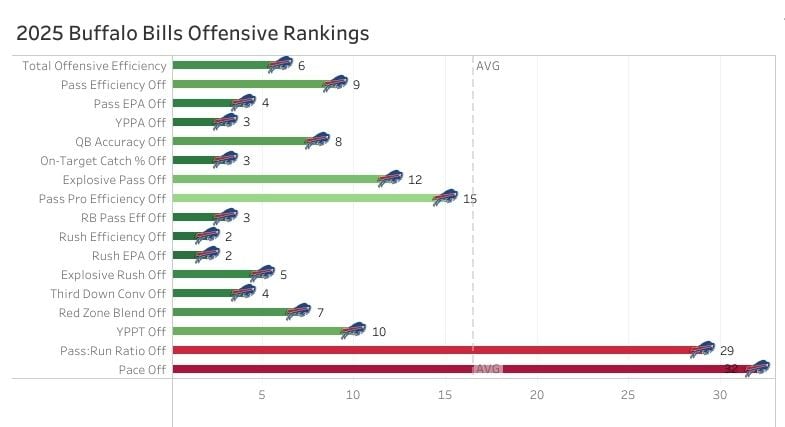 Skeptics will point to Buffalo’s strengths being the offensive line, James Cook, Allen’s own rushing ability, and the subpar group of pass catchers they have as the primary components for leaning into the run, but any time Buffalo was pressed to throw the football last season, they were successful.