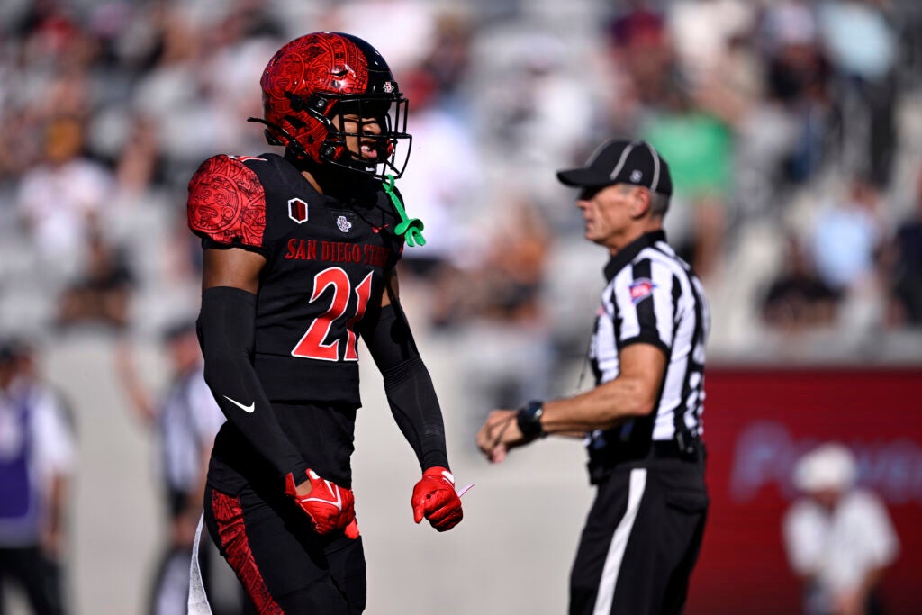Aug 26, 2023; San Diego, California, USA; San Diego State Aztecs cornerback Chris Johnson (21) celebrates after a stop against the Ohio Bobcats during the first half at Snapdragon Stadium. Mandatory Credit: Orlando Ramirez-USA TODAY Sports