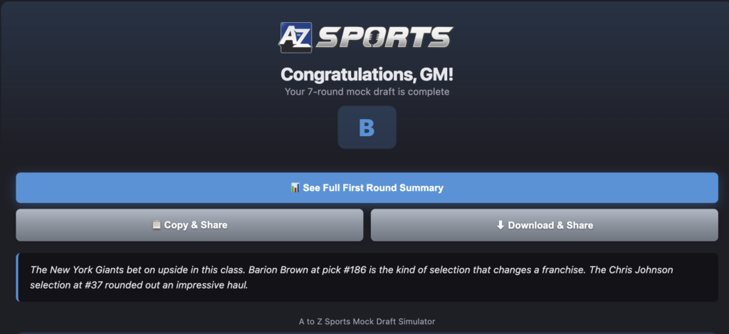 Using our A to Z Sports mock draft simulator, I compiled a “B” for my overall efforts: