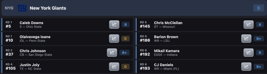The biggest “dings” were Ioane and Joly. I have to highly disagree with the “C” given for the Ioane pick. Although, I will have to say I turned down a trade offer from the Buccaneers that would’ve given the Giants the 77th and 116th overall picks in order to move up from 15 to 10. The logic behind the denial is another team could’ve swooped in and snagged Ioane. For a player like him, the gamble wasn’t worth it.