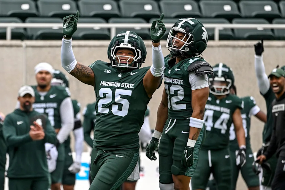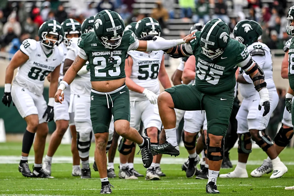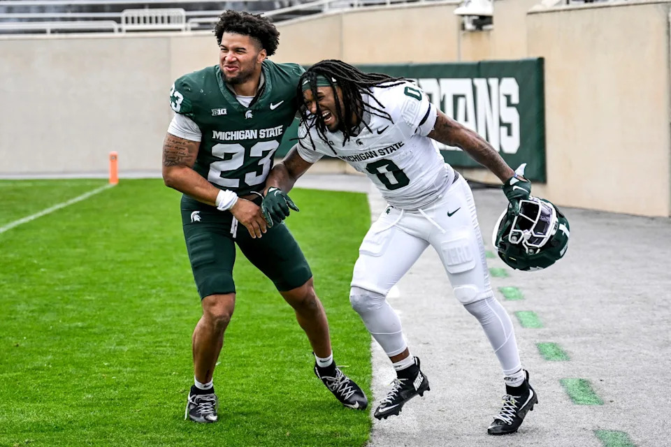 Michigan State’s Carlos Hazelwood, left, and Evan Young celebrate after a play during the football Spring Showcase on Saturday, April 18, 2026, at Spartan Stadium in East Lansing.
