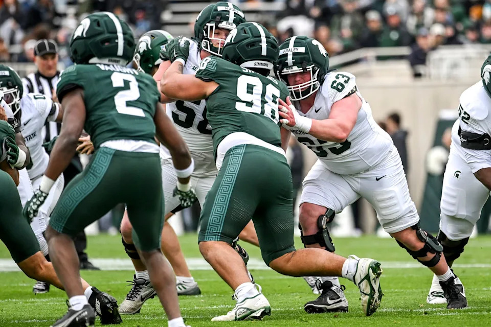 Michigan State’s Conner Moore, left, and Trent Fraley, right, block Derrick Simmons, center, during the football Spring Showcase on Saturday, April 18, 2026, at Spartan Stadium in East Lansing.