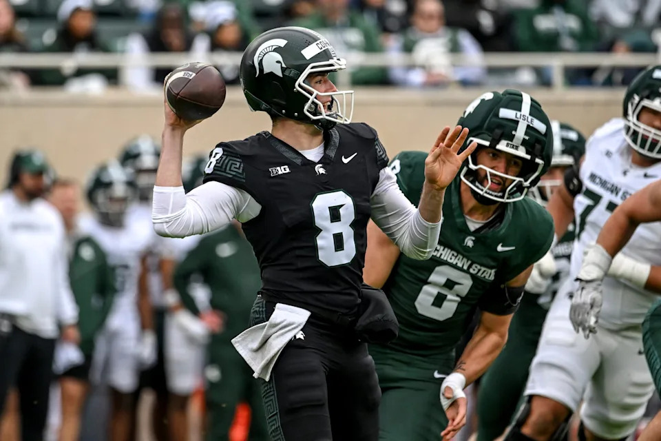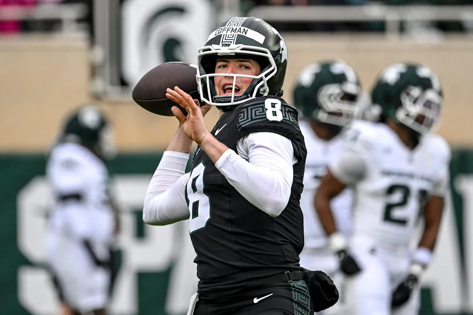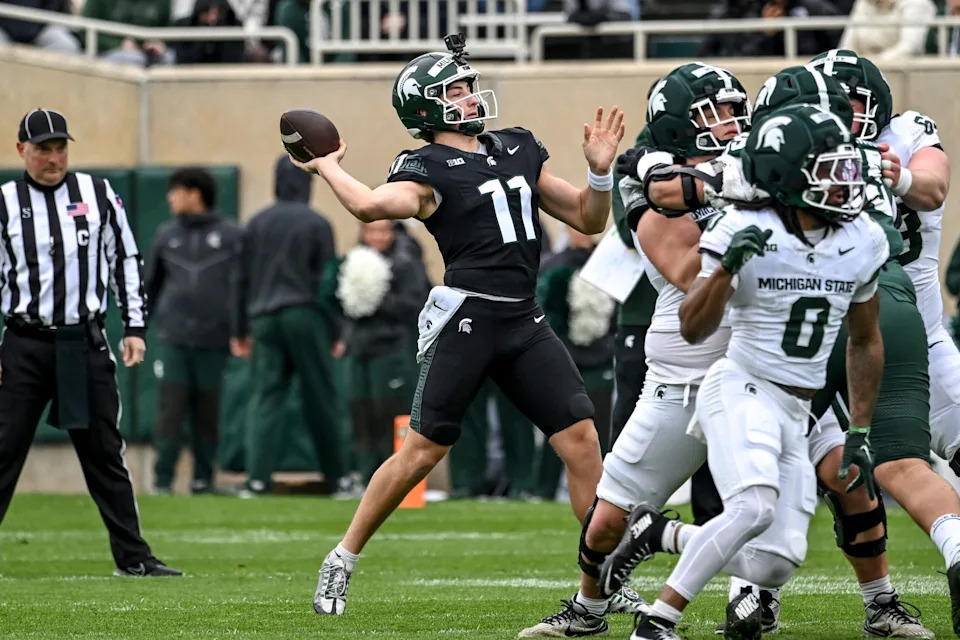 Michigan State’s Kayd Coffman throws the ball during the football Spring Showcase on Saturday, April 18, 2026, at Spartan Stadium in East Lansing.