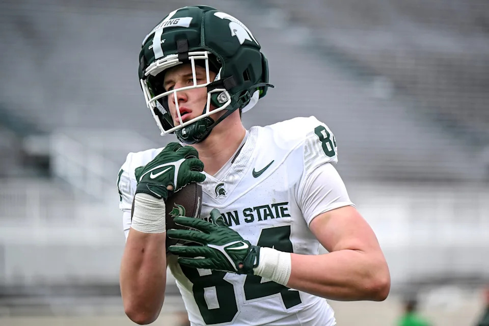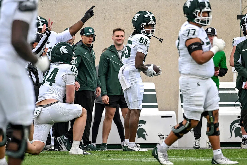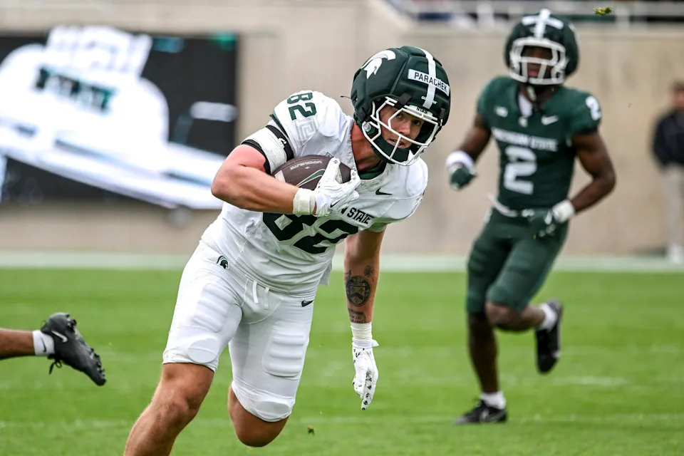 Michigan State’s Brennan Parachek runs after a catch during the football Spring Showcase on Saturday, April 18, 2026, at Spartan Stadium in East Lansing.