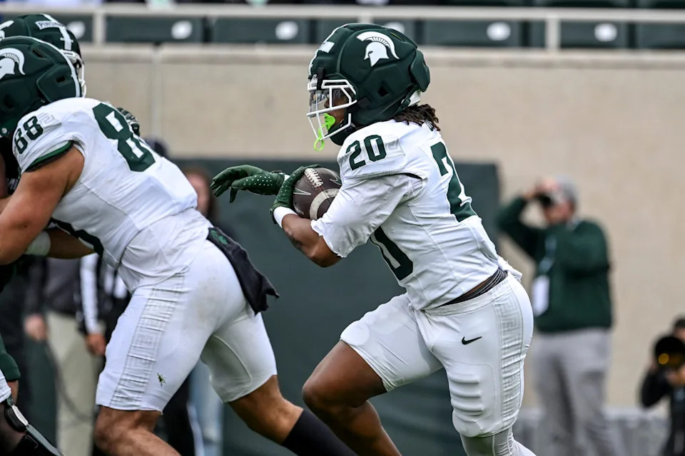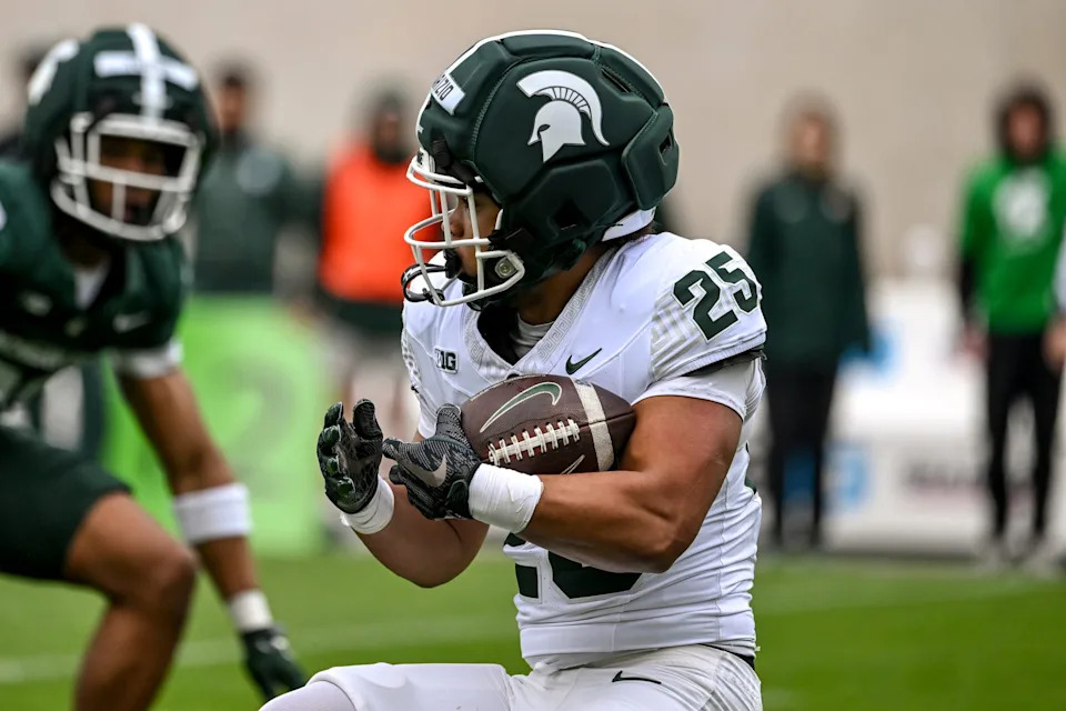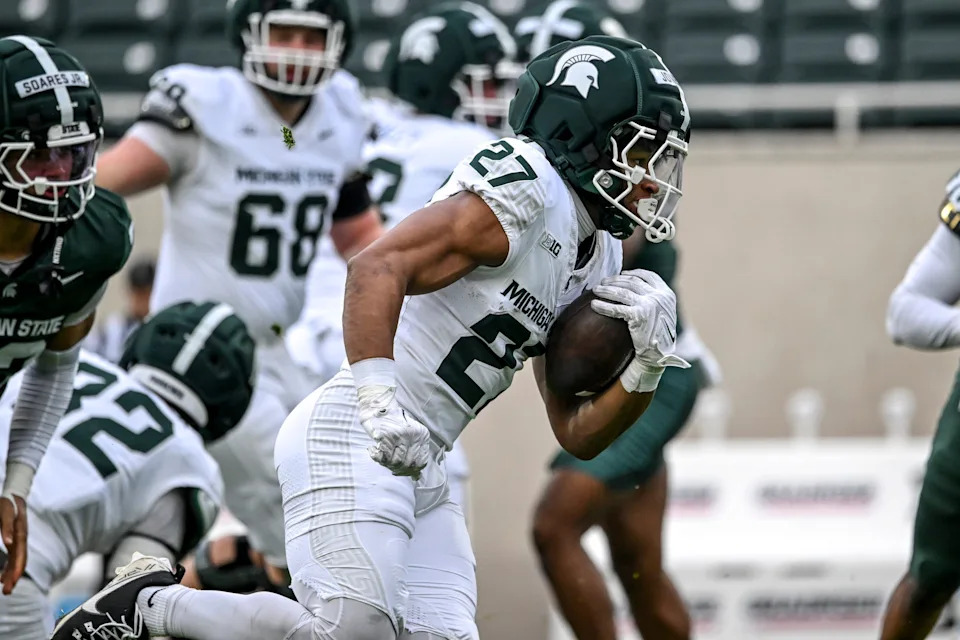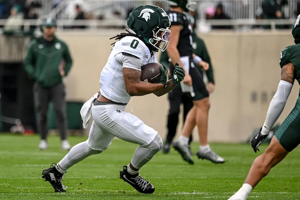 Michigan State’s Darrin Jones Jr. runs the ball during the football Spring Showcase on Saturday, April 18, 2026, at Spartan Stadium in East Lansing.