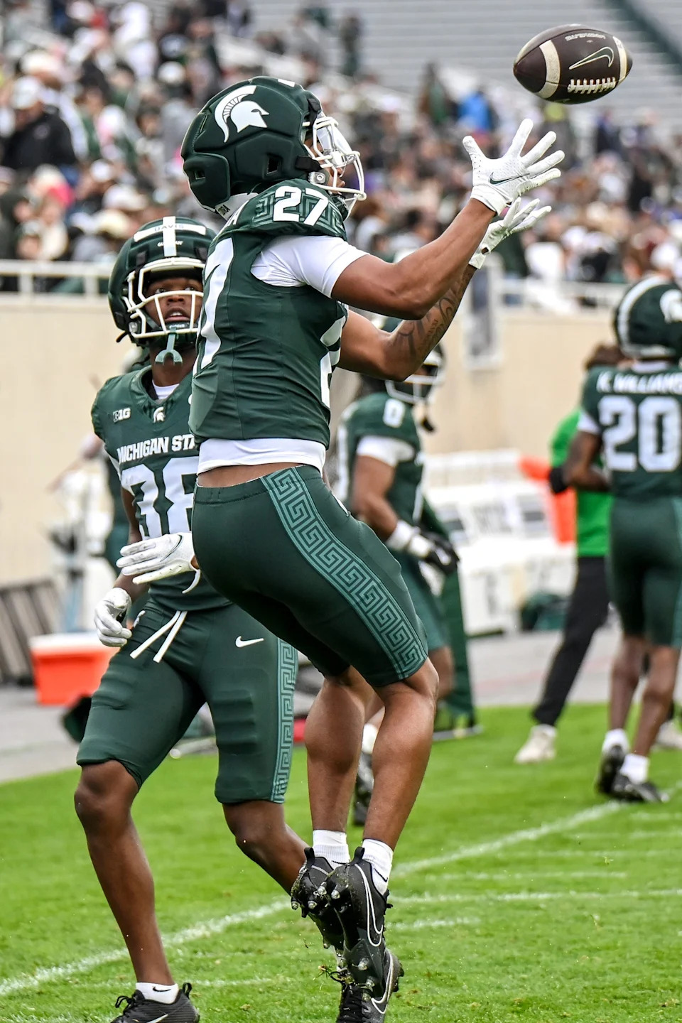 Michigan State’s Rai’Shawn Elmore catches a pass during the football Spring Showcase on Saturday, April 18, 2026, at Spartan Stadium in East Lansing.