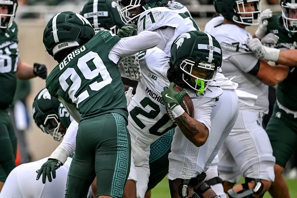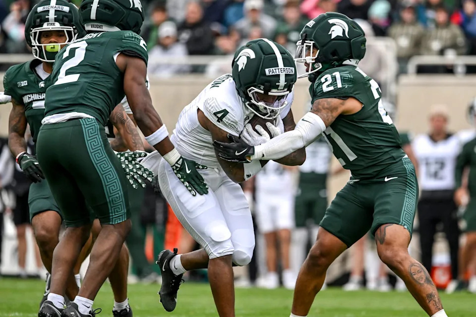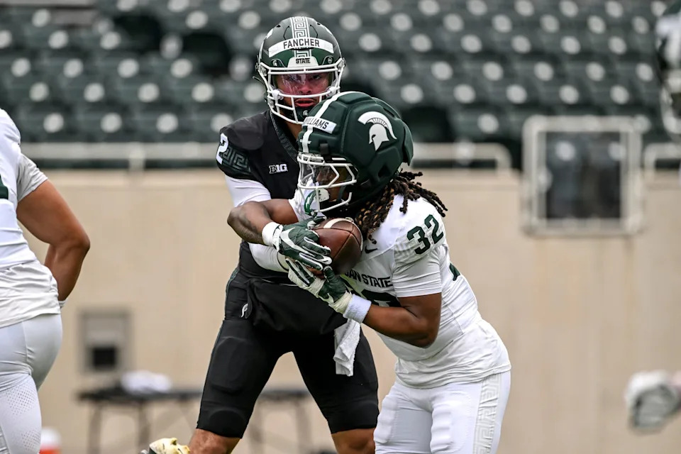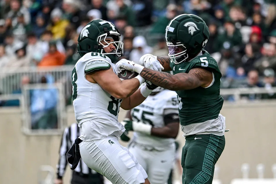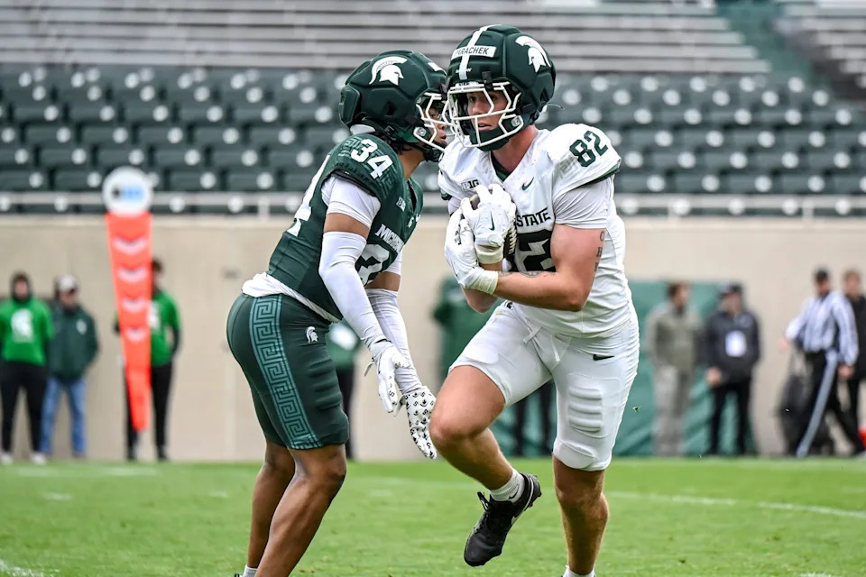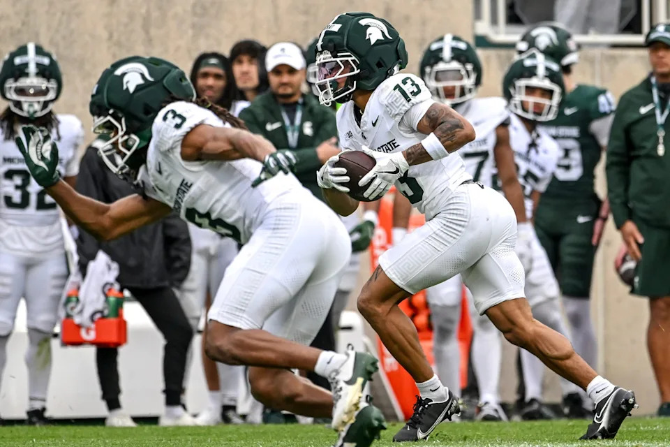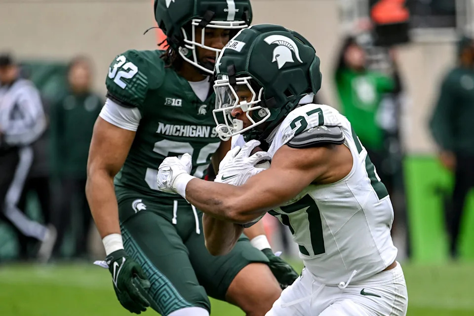 Michigan State’s Jordan Hall, right, stops Kai Rios after a catch during the football Spring Showcase on Saturday, April 18, 2026, at Spartan Stadium in East Lansing.
