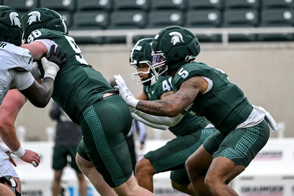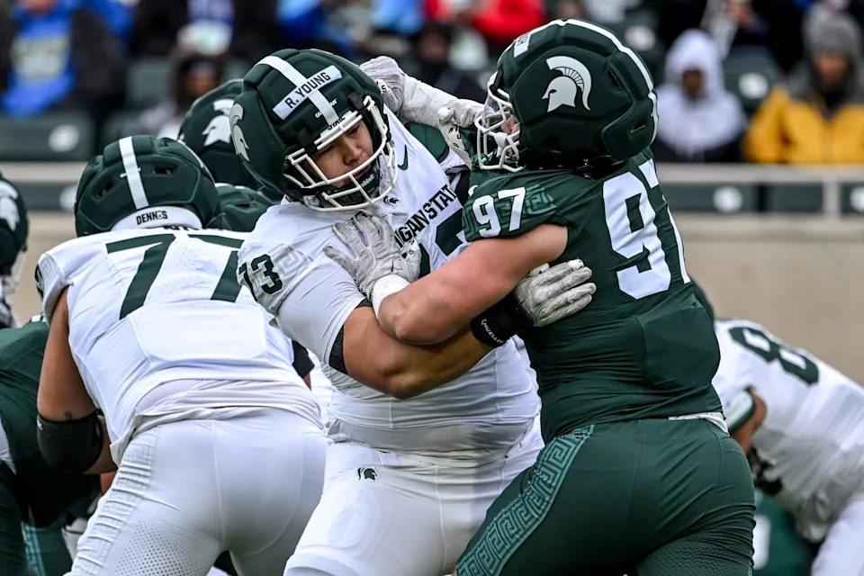 Michigan State’s Rustin Young, left, blocks Cal Thrush during the football Spring Showcase on Saturday, April 18, 2026, at Spartan Stadium in East Lansing.