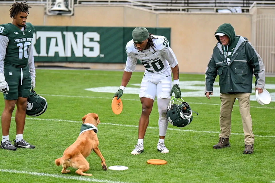 Michigan State’s Zion Gist prepares to throw a disc to Zeke the Wonderdog during the football Spring Showcase on Saturday, April 18, 2026, at Spartan Stadium in East Lansing.