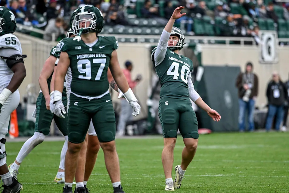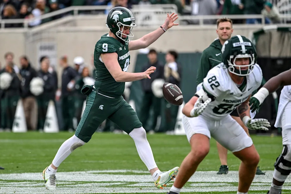 Michigan State’s Rhys Dakin punts the ball during the football Spring Showcase on Saturday, April 18, 2026, at Spartan Stadium in East Lansing.