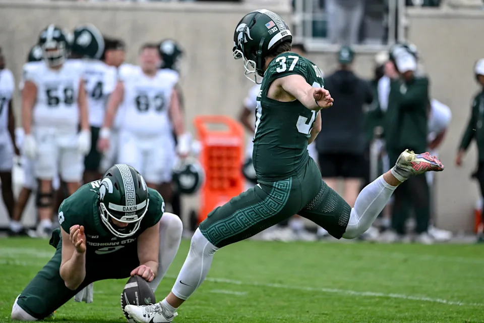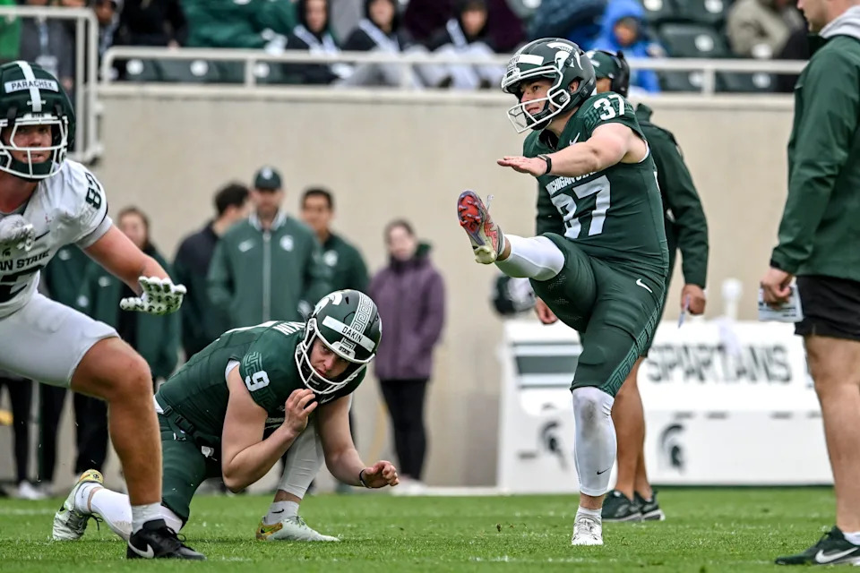 Michigan State’s Liam Boyd kicks a field goal during the football Spring Showcase on Saturday, April 18, 2026, at Spartan Stadium in East Lansing.