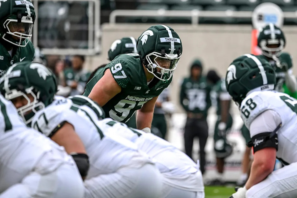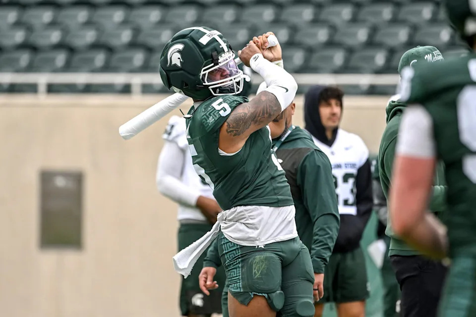 Michigan State’s Derrick Simmons looks on during the football Spring Showcase on Saturday, April 18, 2026, at Spartan Stadium in East Lansing.