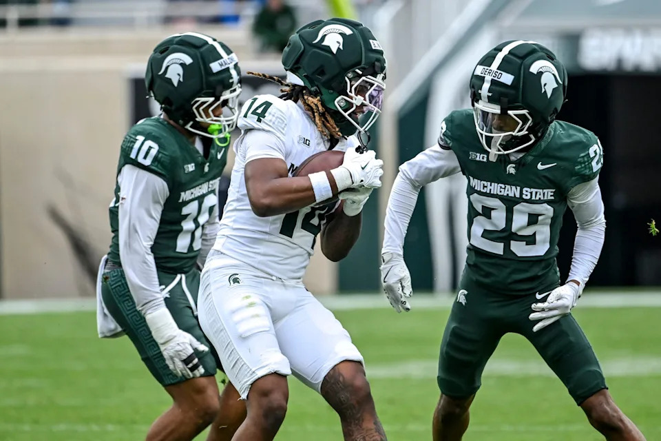 Michigan State’s Andrew Brinson IV CB Bryson Williams, center, catches a pass as KJ Deriso, right, closes in during the football Spring Showcase on Saturday, April 18, 2026, at Spartan Stadium in East Lansing.