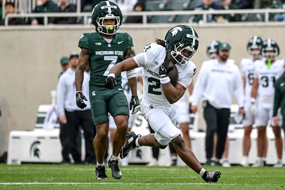 Michigan State’s Chrishon McCray runs after a catch during the football Spring Showcase on Saturday, April 18, 2026, at Spartan Stadium in East Lansing.