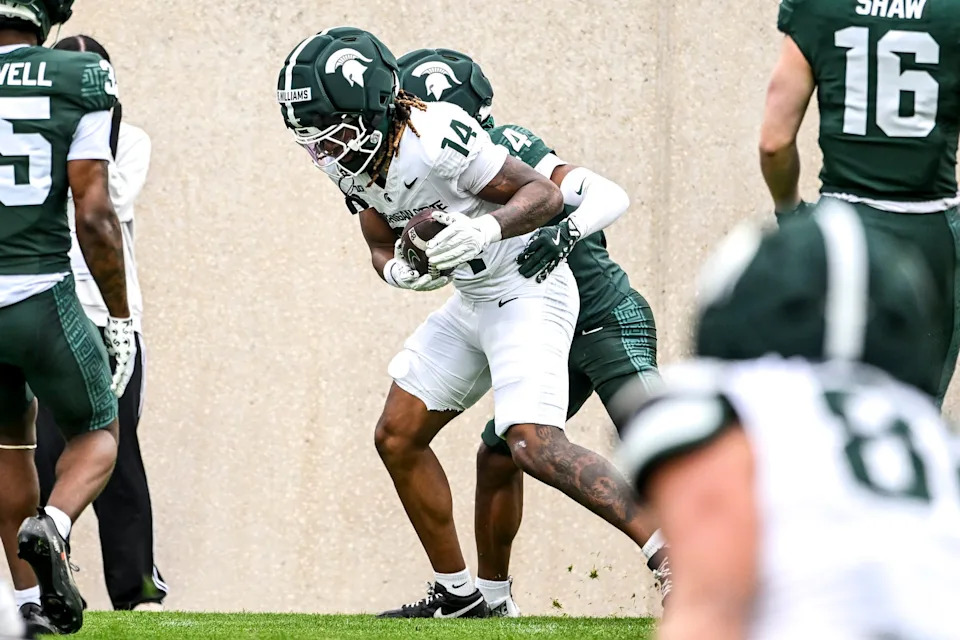 Michigan State’s Bryson Williams catches a pass during the football Spring Showcase on Saturday, April 18, 2026, at Spartan Stadium in East Lansing.