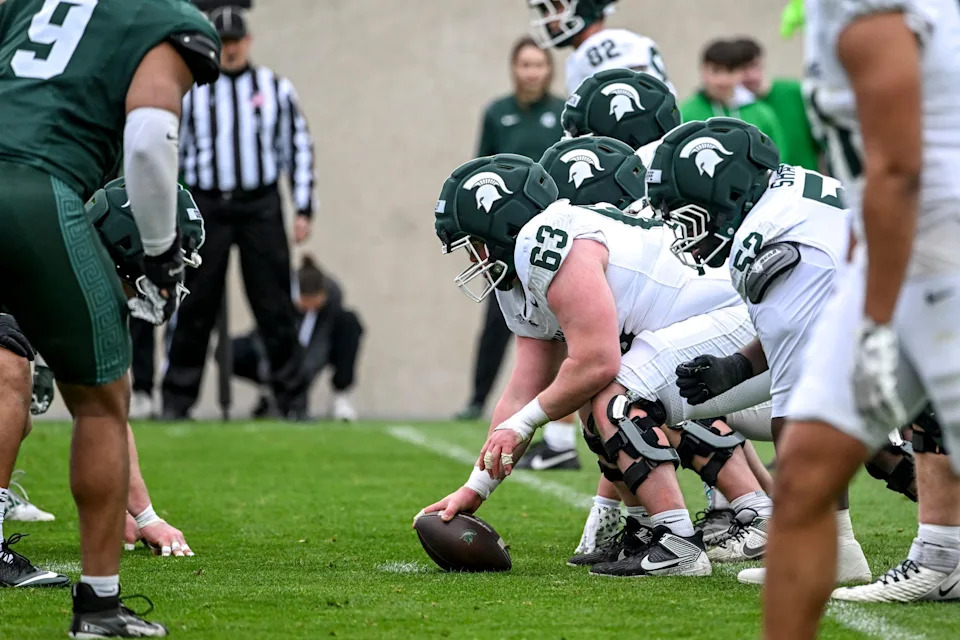Michigan State’s Trent Fraley, center, prepares to snap the ball during the football Spring Showcase on Saturday, April 18, 2026, at Spartan Stadium in East Lansing.