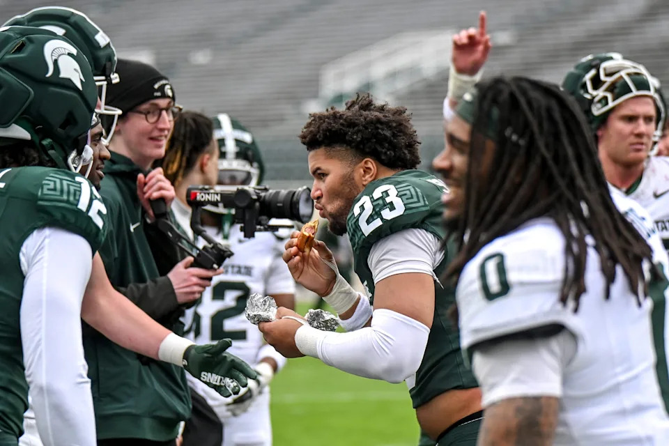 Michigan State’s Tre Bell jokes with teammates during the football Spring Showcase on Saturday, April 18, 2026, at Spartan Stadium in East Lansing.