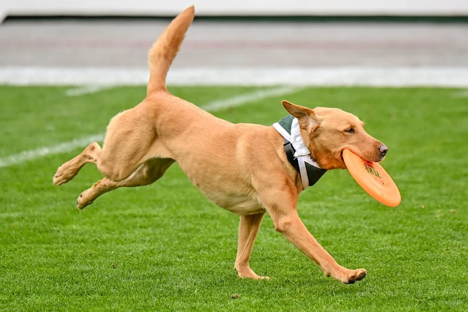Zeke the Wonderdog catches a frisbee during the Michigan State football Spring Showcase on Saturday, April 18, 2026, at Spartan Stadium in East Lansing.