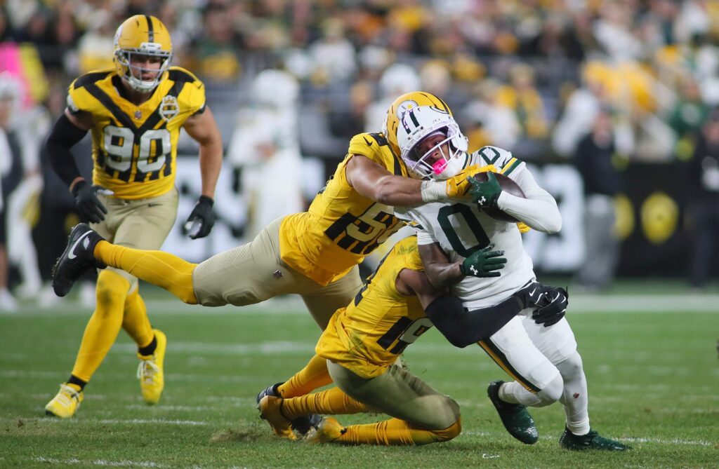 Green Bay Packers wide receiver Matthew Golden (0) gets wrapped up for a tackle by Pittsburgh Steelers linebacker Alex Highsmith (56) and defensive back Chuck Clark (21) during the second half at Acrisure Stadium in Pittsburgh, PA on October 26, 2025. Credit: Michael Longo / For USA Today Network