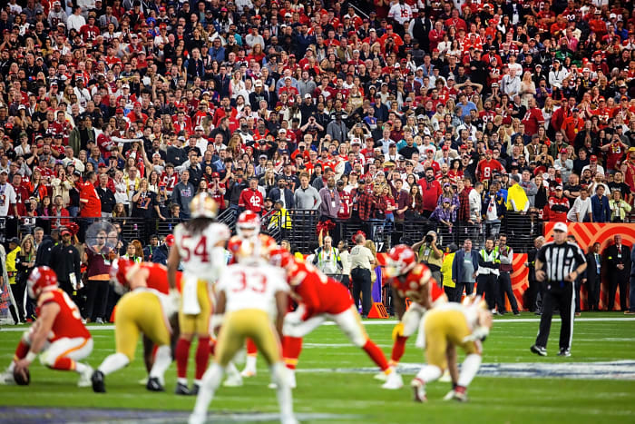 Feb 11, 2024; Paradise, Nevada, USA; General view of fans in the crowd during the Kansas City Chiefs game against the San Francisco 49ers in Super Bowl LVIII at Allegiant Stadium. Mandatory Credit: Mark J. Rebilas-USA TODAY Sports