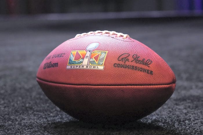 Feb 9, 2026; San Francisco, CA, USA; A NFL Wilson Duke official football with Super Bowl 61 (LXI) logo at the Super Bowl LX host committee handoff press conference at Moscone Center. Mandatory Credit: Kirby Lee-Imagn Images