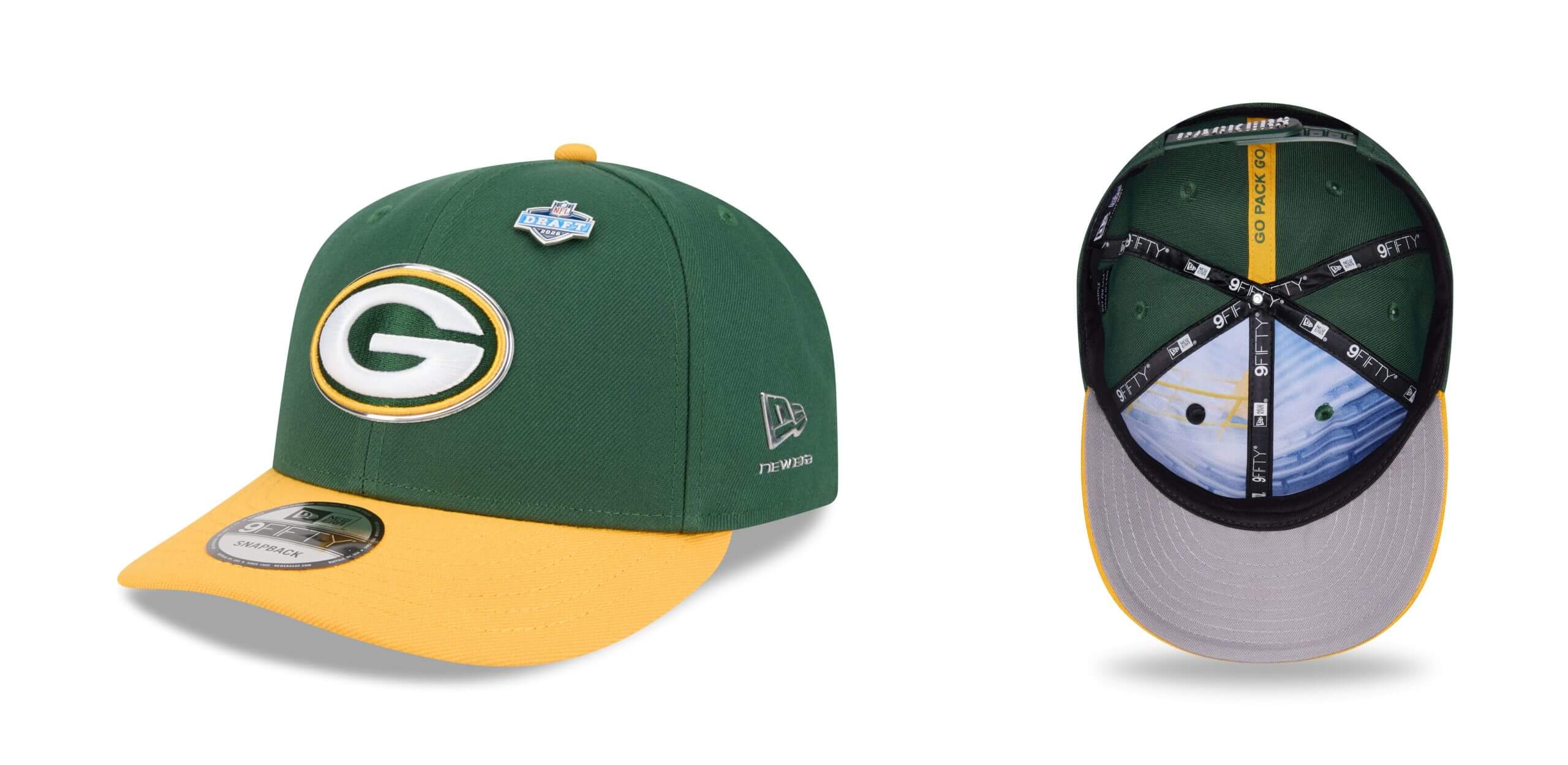 The Packers hat features a look at the famous “frozen tundra” of Lambeau Field with an image that will likely make the team’s draftees wish they were handed a winter knit cap instead.