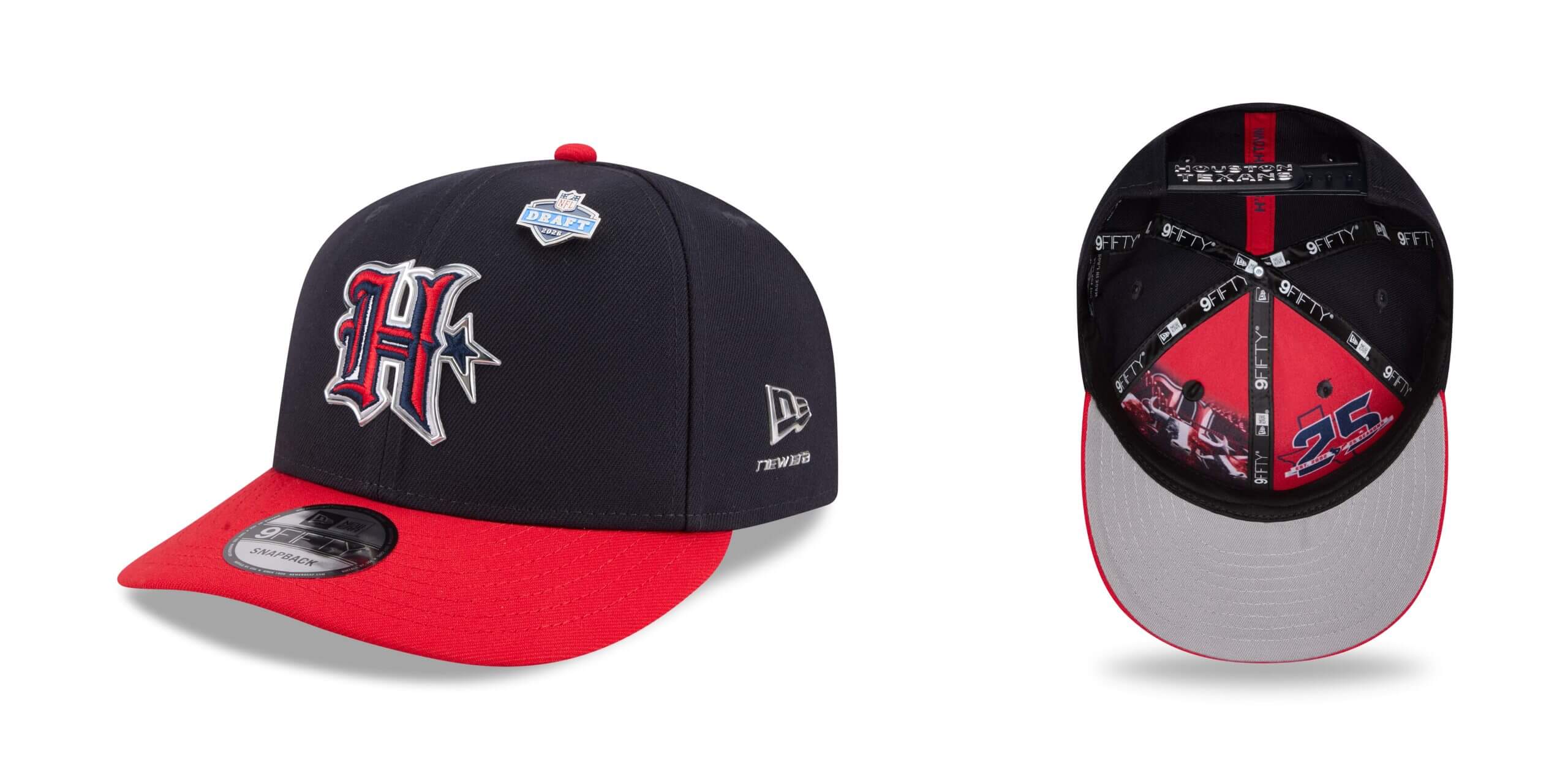 Inside the Texans hat are two distinct logos: the Houston “H” that is featured on the team’s alternate helmets, as well as an anniversary logo celebrating 25 years in the NFL.