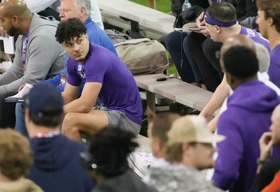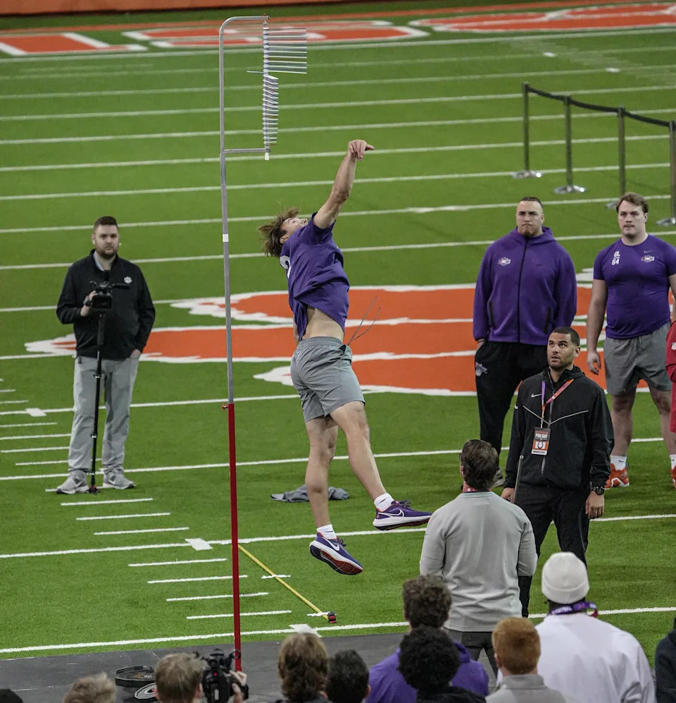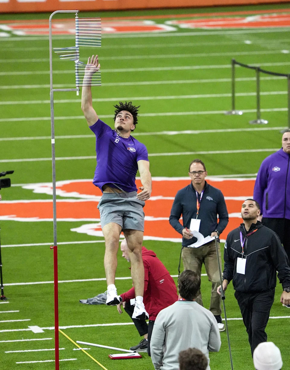 Former Clemson quarterback Cade Klubnick performs the vertical jump during 2026 Clemson Pro Day in the Poe Indoor Facility at Clemson University in Clemson Thursday, March 12, 2026.