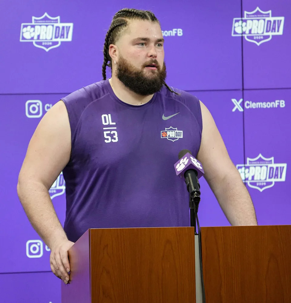 Former Clemson offensive lineman Walker Parks speaks to media during 2026 Clemson Pro Day in the Poe Indoor Facility at Clemson University in Clemson Thursday, March 12, 2026.