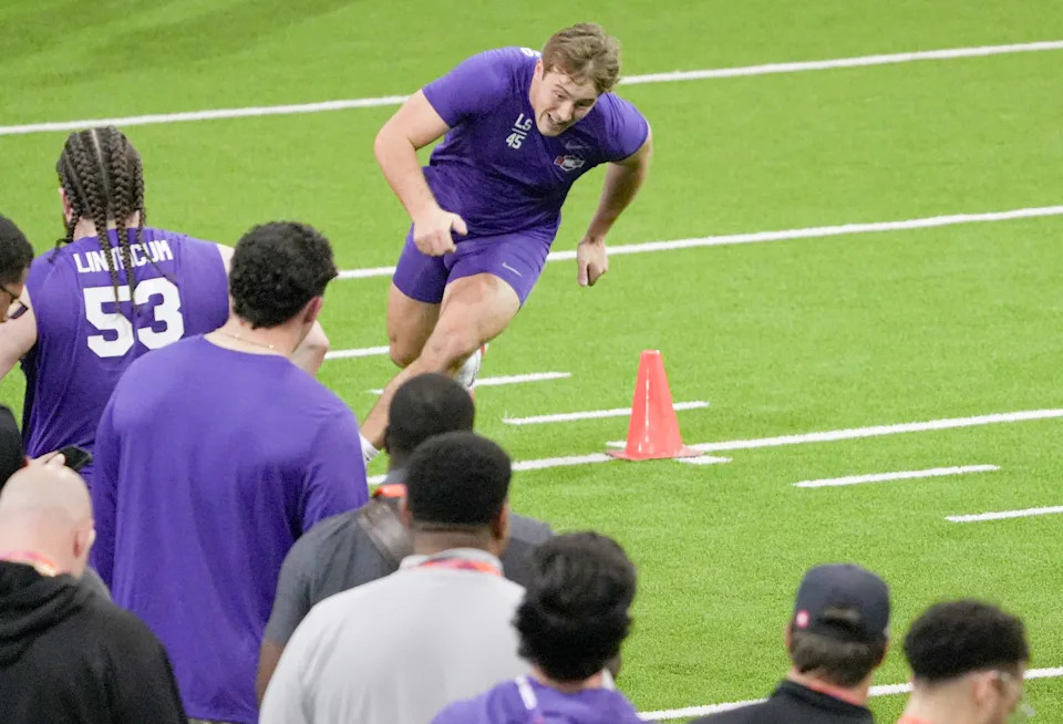Former Clemson offensive lineman Ryan Lithicum performs a 5.44 second 40-yard dash during 2026 Clemson Pro Day in the Poe Indoor Facility at Clemson University in Clemson Thursday, March 12, 2026.