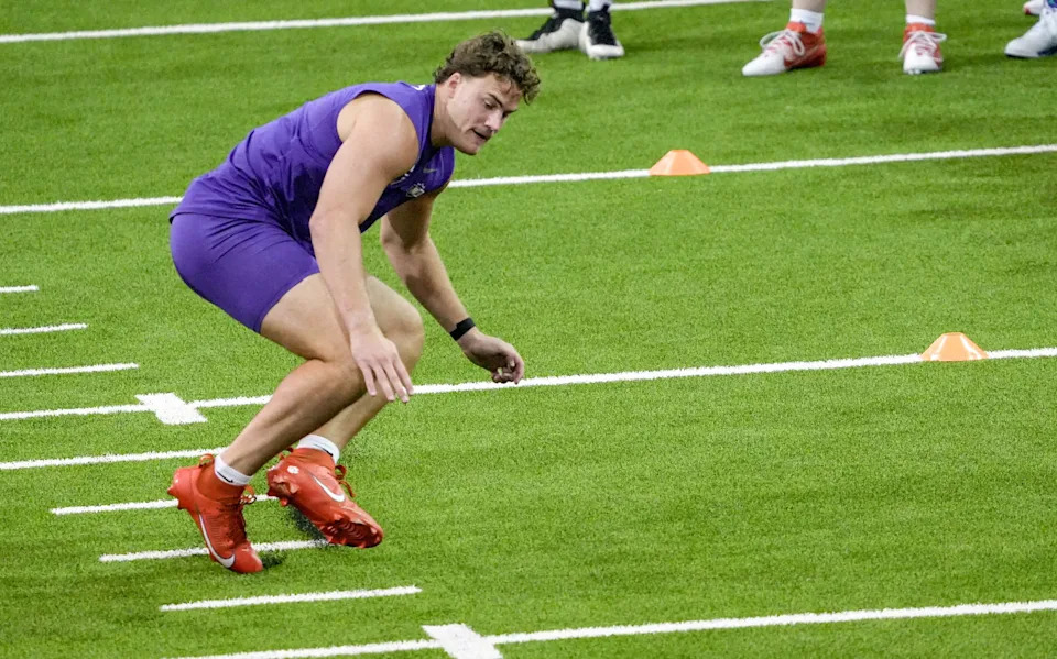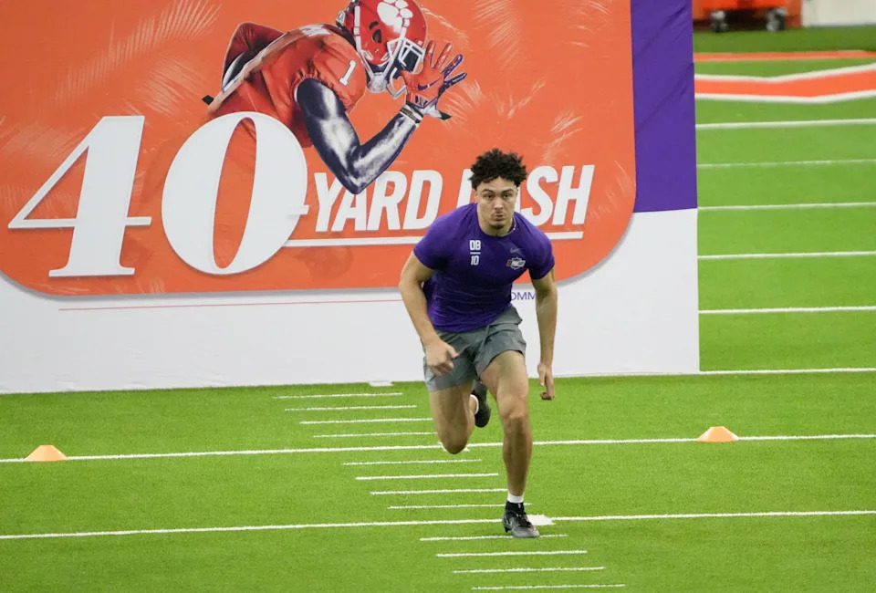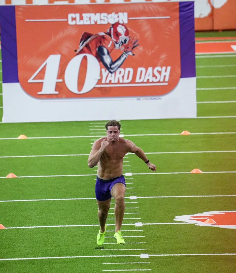 Former Clemson defensive end Cade Denhoff performs the 40-yard dash during 2026 Clemson Pro Day in the Poe Indoor Facility at Clemson University in Clemson Thursday, March 12, 2026.