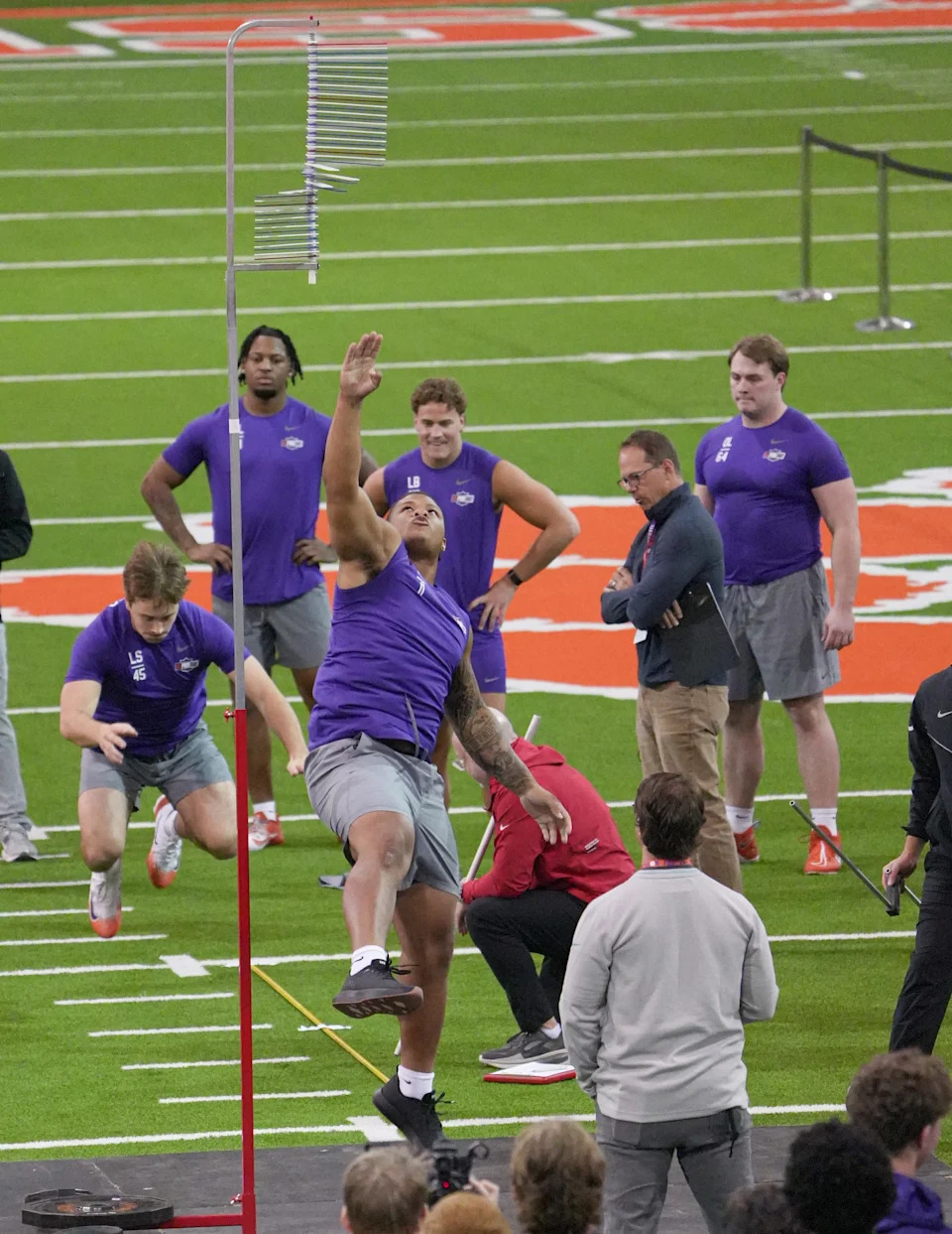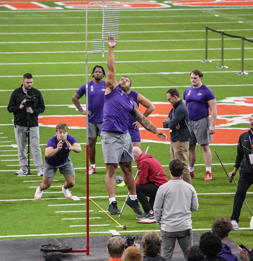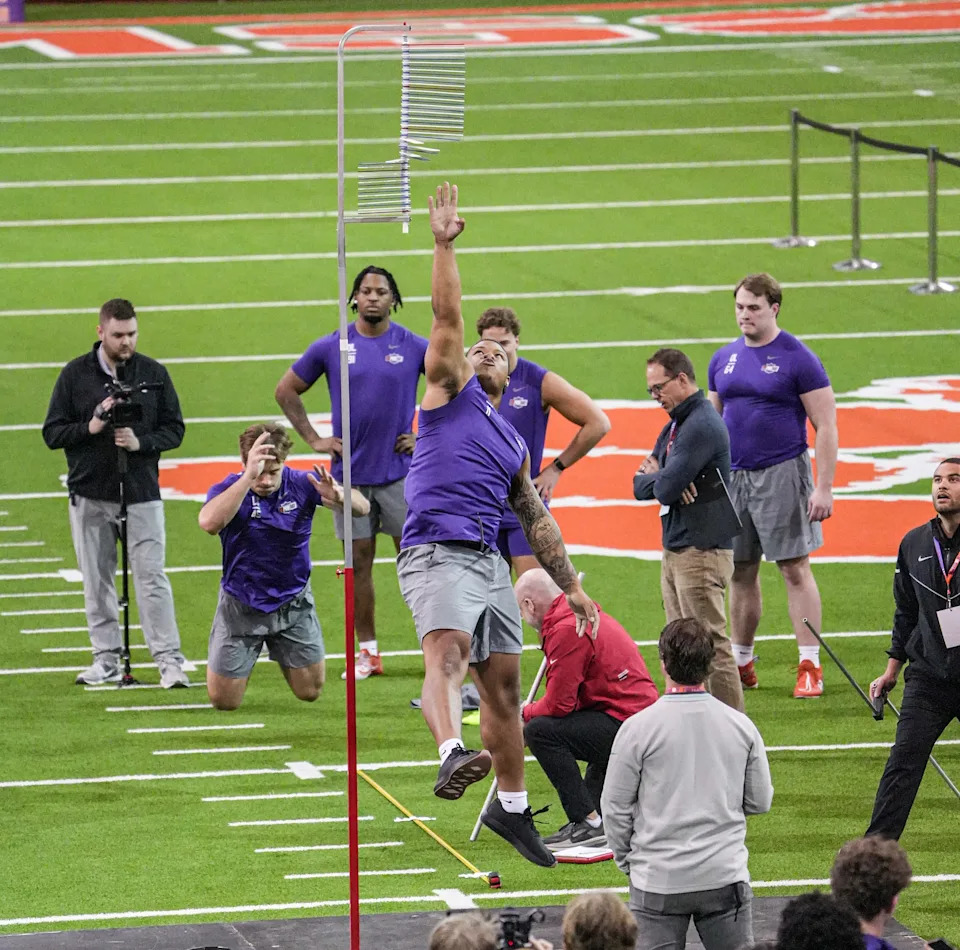 Former Clemson defensive tackle Peter Woods performs the vertical jump during 2026 Clemson Pro Day in the Poe Indoor Facility at Clemson University in Clemson Thursday, March 12, 2026.