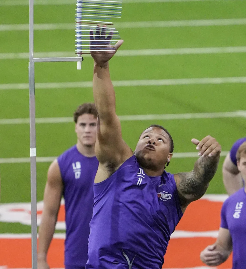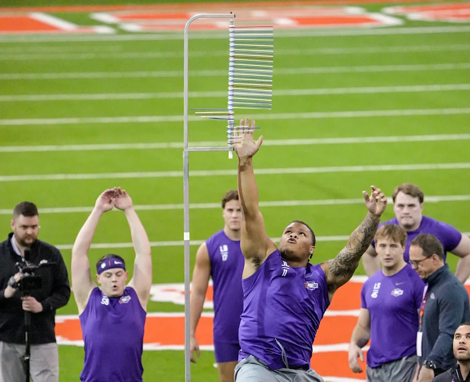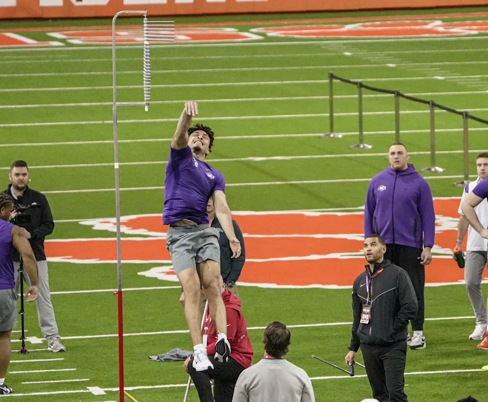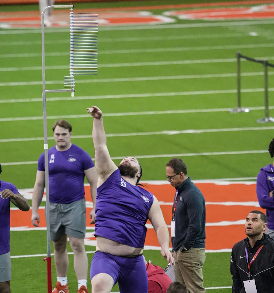 Former Clemson defensive tackle Peter Woods performs the vertical jump during 2026 Clemson Pro Day in the Poe Indoor Facility at Clemson University in Clemson Thursday, March 12, 2026.