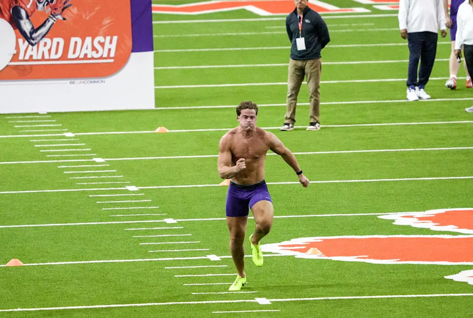 Former Clemson linebacker Wade Woodaz performs the 40-yard dash during 2026 Clemson Pro Day in the Poe Indoor Facility at Clemson University in Clemson Thursday, March 12, 2026.