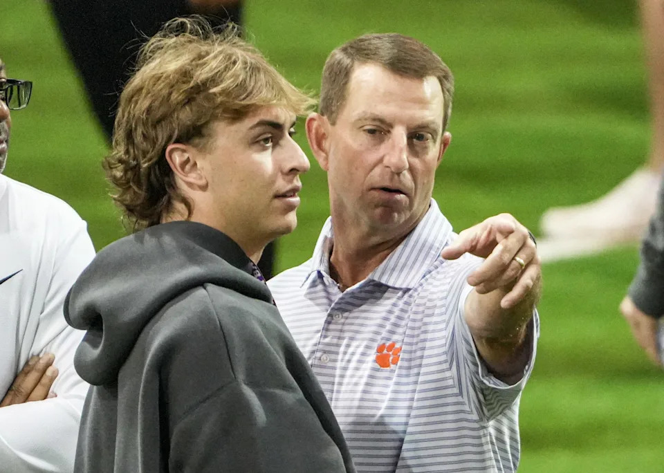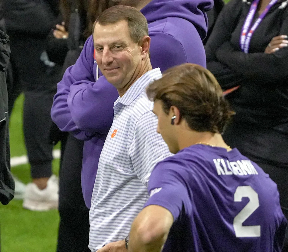 Clemson football head coach Dabo Swinney watches Former Clemson quarterback Cade Klubnick walk by during 2026 Clemson Pro Day in the Poe Indoor Facility at Clemson University in Clemson Thursday, March 12, 2026.