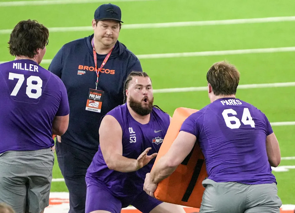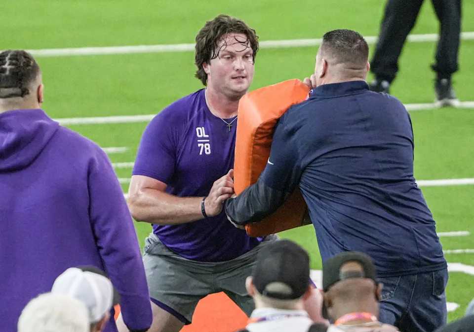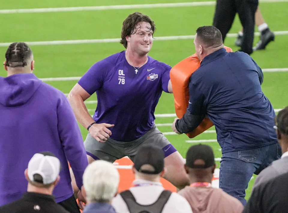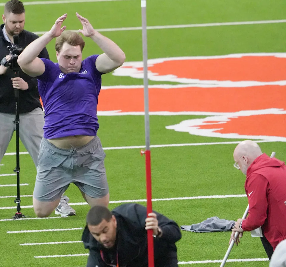 Former Clemson offensive lineman Walker Parks performs the offensive line drill during 2026 Clemson Pro Day in the Poe Indoor Facility at Clemson University in Clemson Thursday, March 12, 2026.