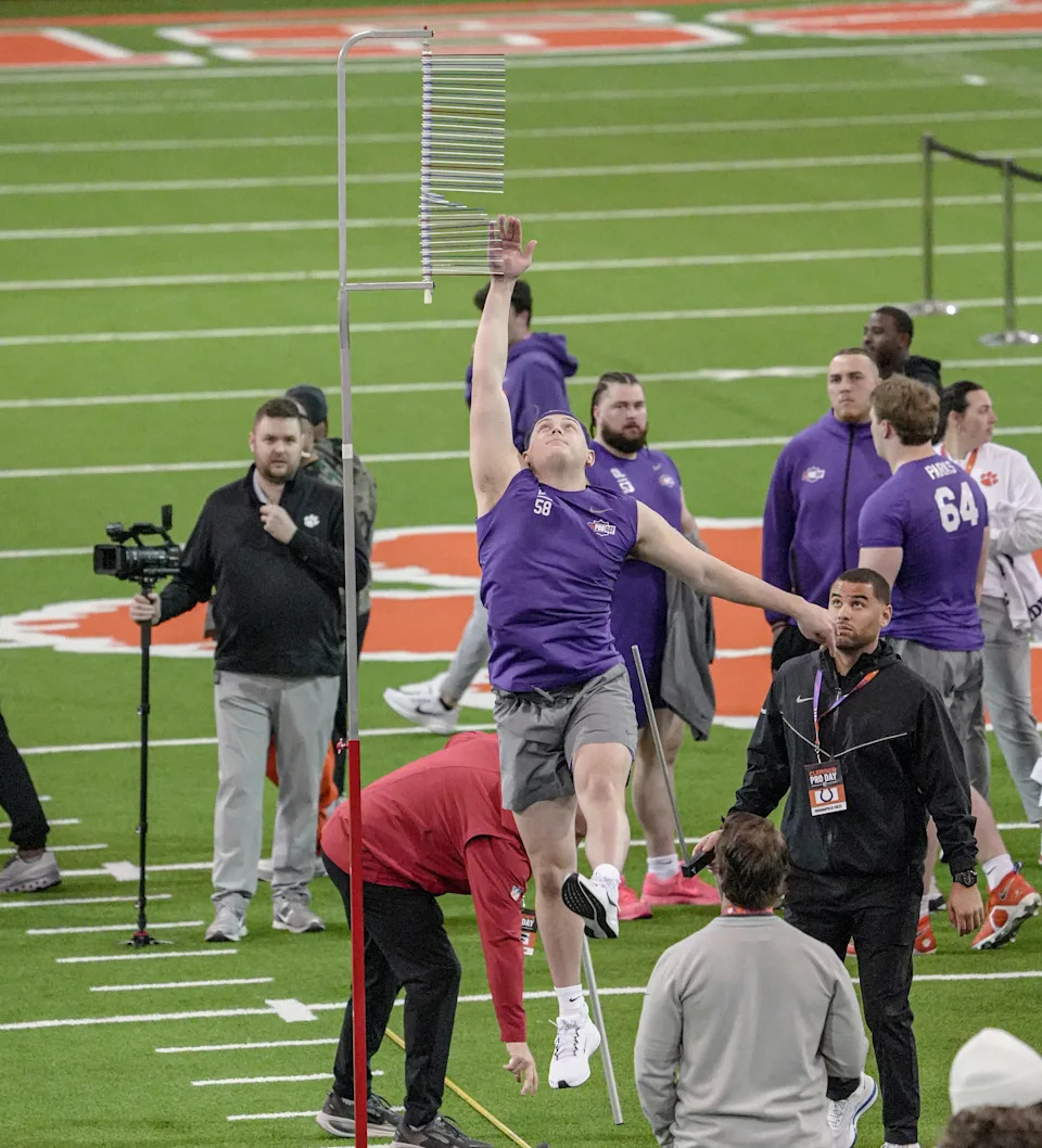 Former Clemson offensive lineman Ryan Lithicum performs the vertical jump during 2026 Clemson Pro Day in the Poe Indoor Facility at Clemson University in Clemson Thursday, March 12, 2026.