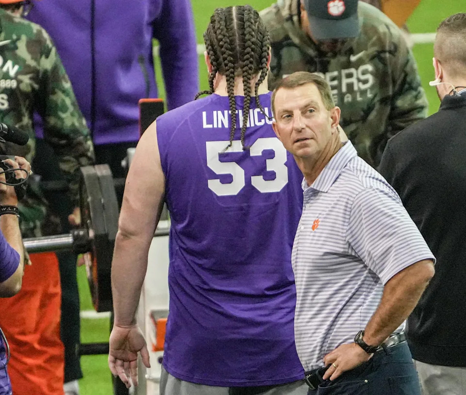 Clemson kicker Nolan Hauser, left, talks with head coach Dabo Swinney during 2026 Clemson Pro Day in the Poe Indoor Facility at Clemson University in Clemson Thursday, March 12, 2026.