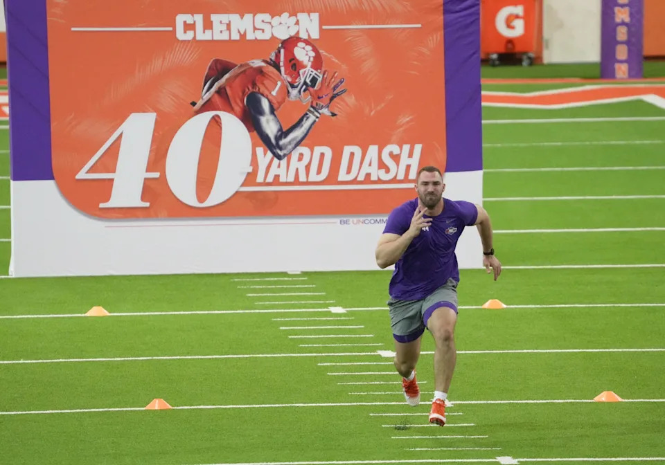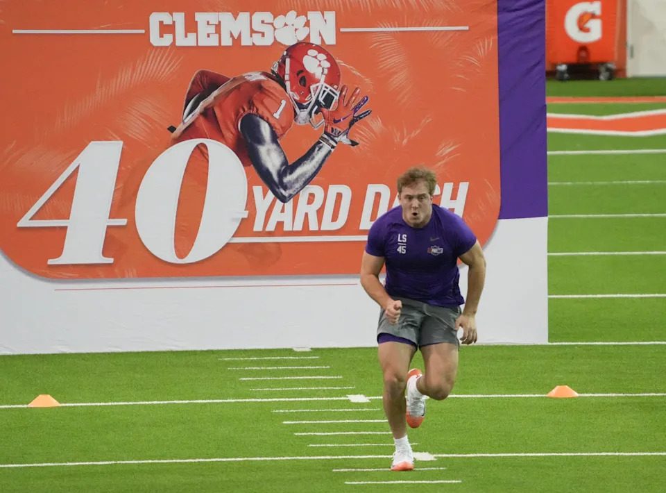 Former Clemson longsnapper Philip Florenzo performs the 40-yard dash during 2026 Clemson Pro Day in the Poe Indoor Facility at Clemson University in Clemson Thursday, March 12, 2026.