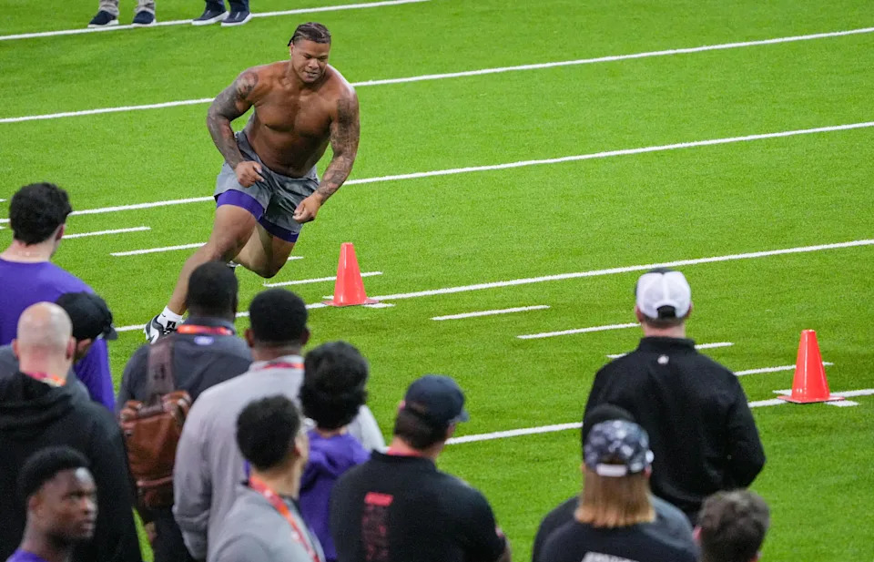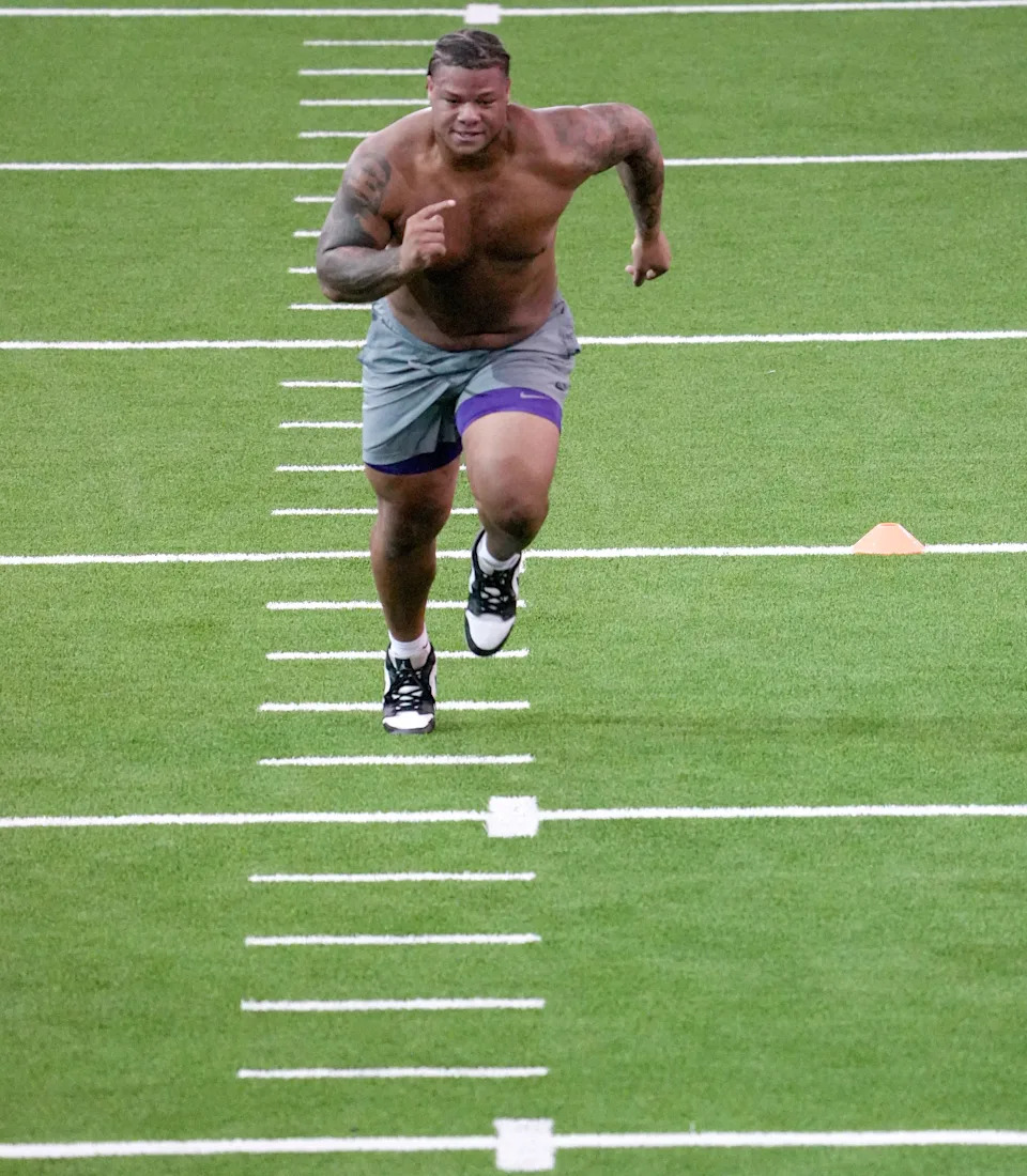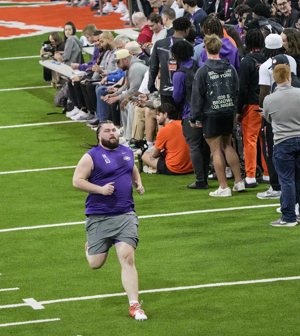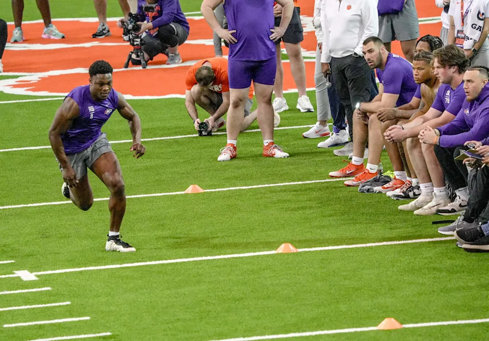 Former Clemson defensive tackle Peter Woods performs the 10-yard split during 2026 Clemson Pro Day in the Poe Indoor Facility at Clemson University in Clemson Thursday, March 12, 2026.
