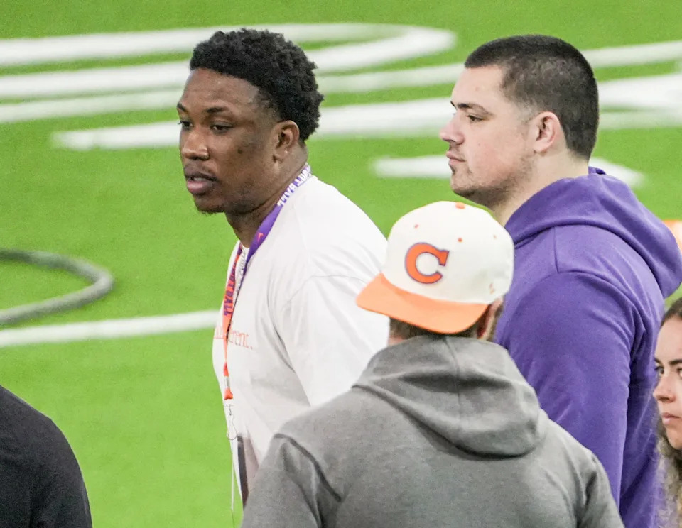 KJ Henry and Bryan Breese, former Clemson Tiger football players now in the NFL, watch during 2026 Clemson Pro Day in the Poe Indoor Facility at Clemson University in Clemson Thursday, March 12, 2026.