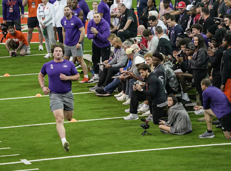 Former Clemson offensive lineman Walker Parks performs the short shuttle during 2026 Clemson Pro Day in the Poe Indoor Facility at Clemson University in Clemson Thursday, March 12, 2026.