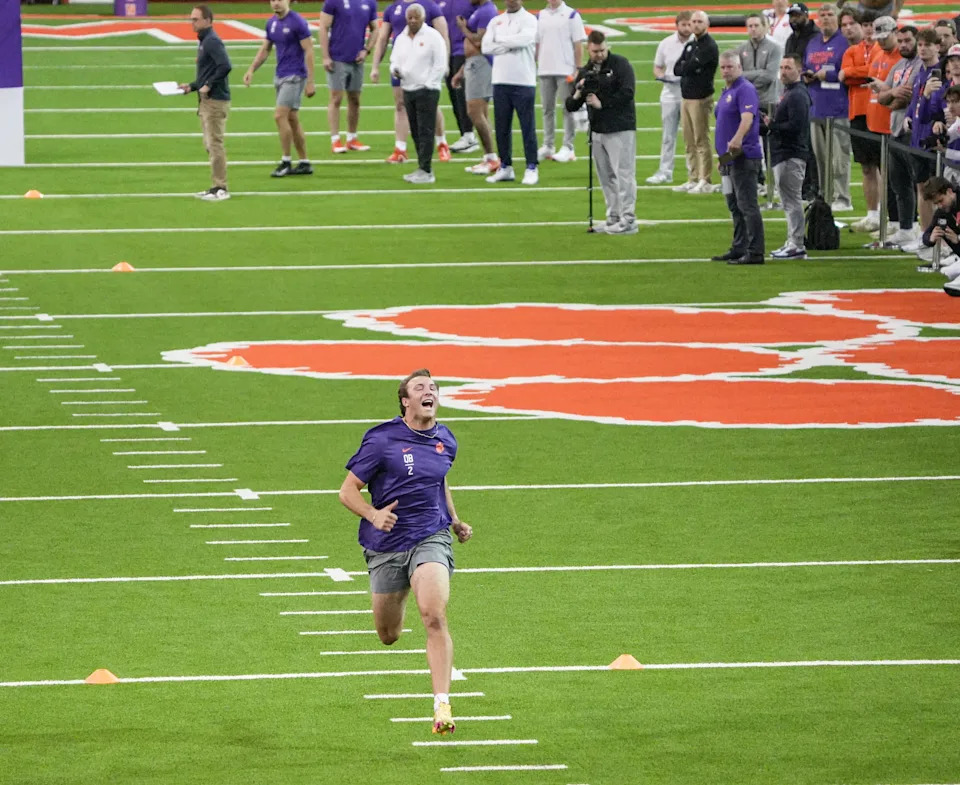 Former Clemson quarterback Cade Klubnick performs 4.57 second 40-yard dash during 2026 Clemson Pro Day in the Poe Indoor Facility at Clemson University in Clemson Thursday, March 12, 2026.