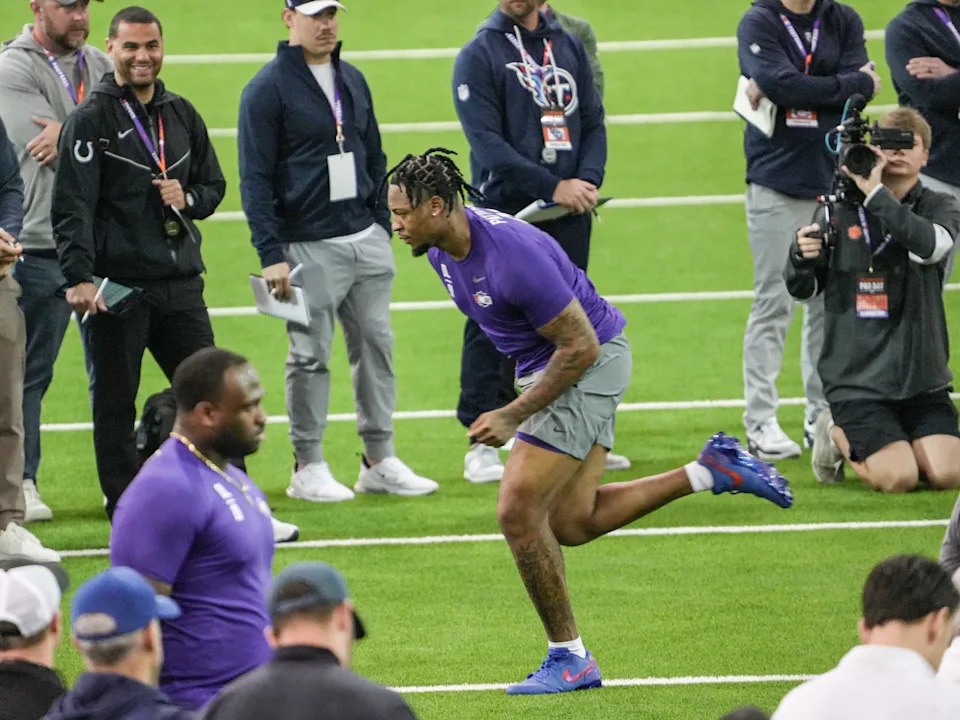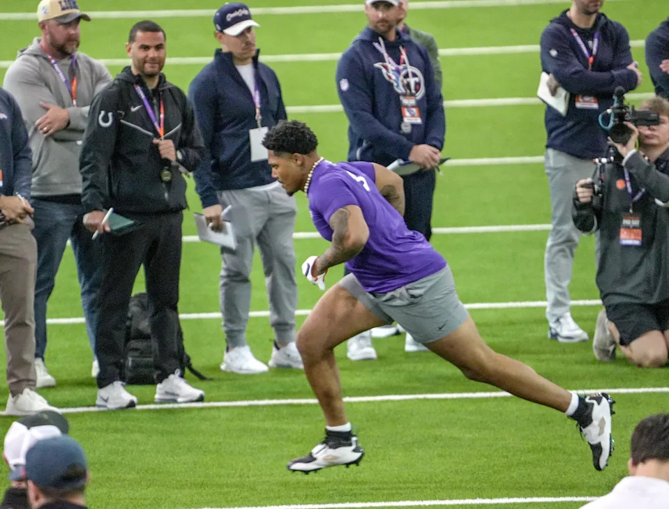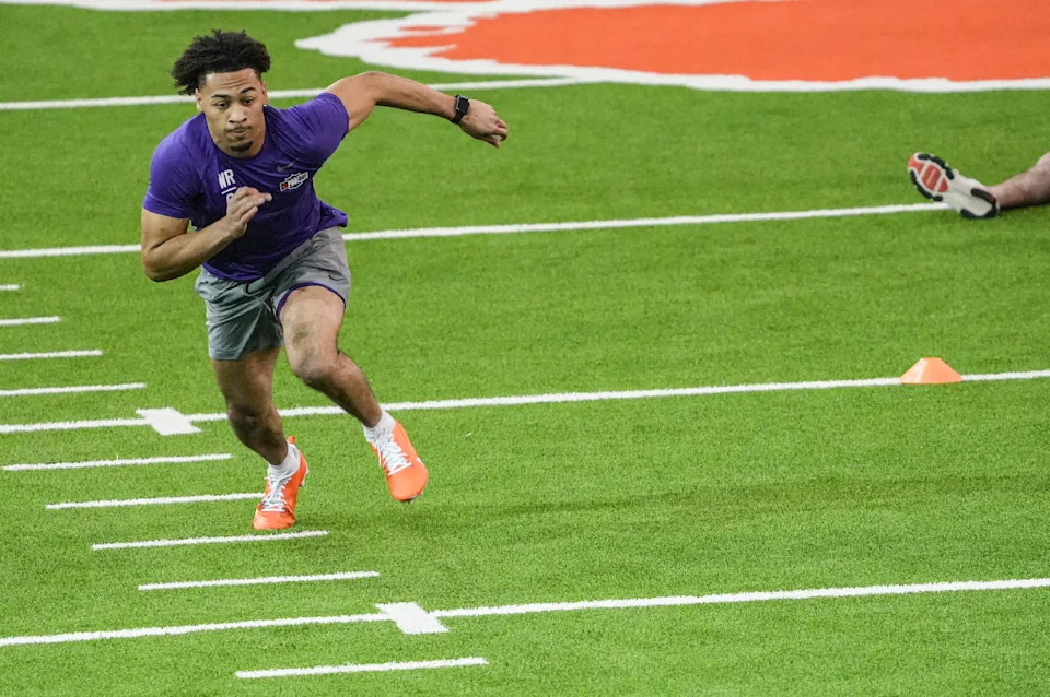 Former Clemson cornerback Jeadyn Lukus performs a 4.39 second 40-yard dash during 2026 Clemson Pro Day in the Poe Indoor Facility at Clemson University in Clemson Thursday, March 12, 2026.