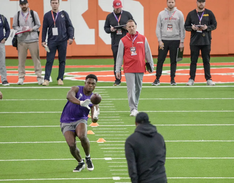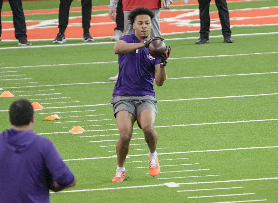 Former Clemson running back Adam Randall performs the wide receiver drill during 2026 Clemson Pro Day in the Poe Indoor Facility at Clemson University in Clemson Thursday, March 12, 2026.