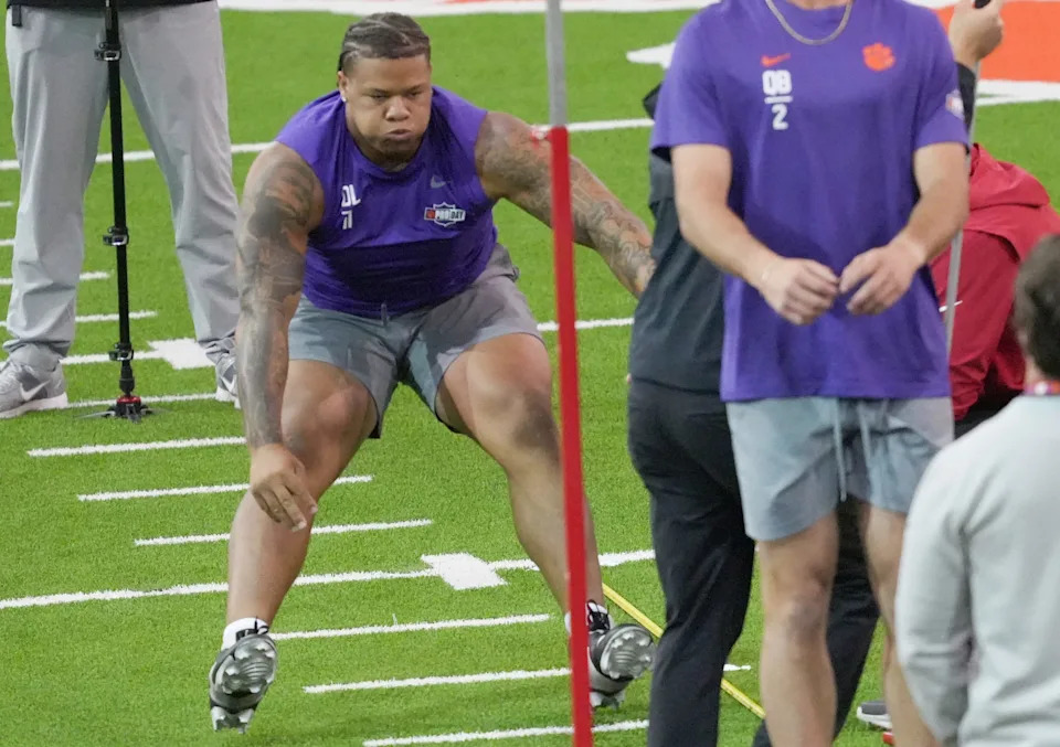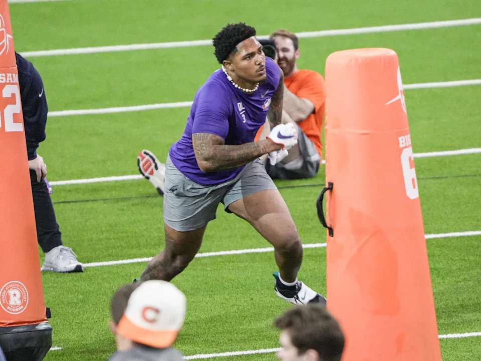 Former Clemson defensive tackle DeMonte Capehart performs the defensive position drill during 2026 Clemson Pro Day in the Poe Indoor Facility at Clemson University in Clemson Thursday, March 12, 2026.