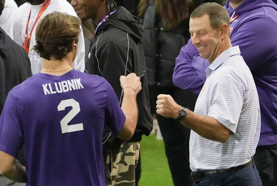Clemson football head coach Dabo Swinney gives a fist bump to former Clemson quarterback Cade Klubnick during 2026 Clemson Pro Day in the Poe Indoor Facility at Clemson University in Clemson Thursday, March 12, 2026.