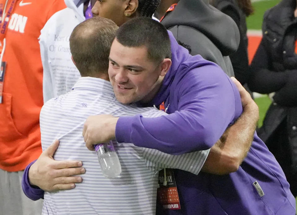 Clemson football head coach Dabo Swinney hugs former Tiger and current NFL New Orleans Saints player Bryan Breese during 2026 Clemson Pro Day in the Poe Indoor Facility at Clemson University in Clemson Thursday, March 12, 2026.